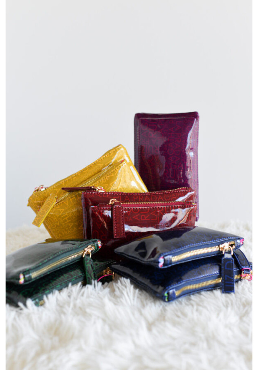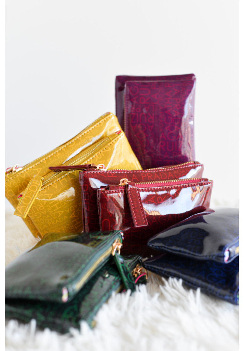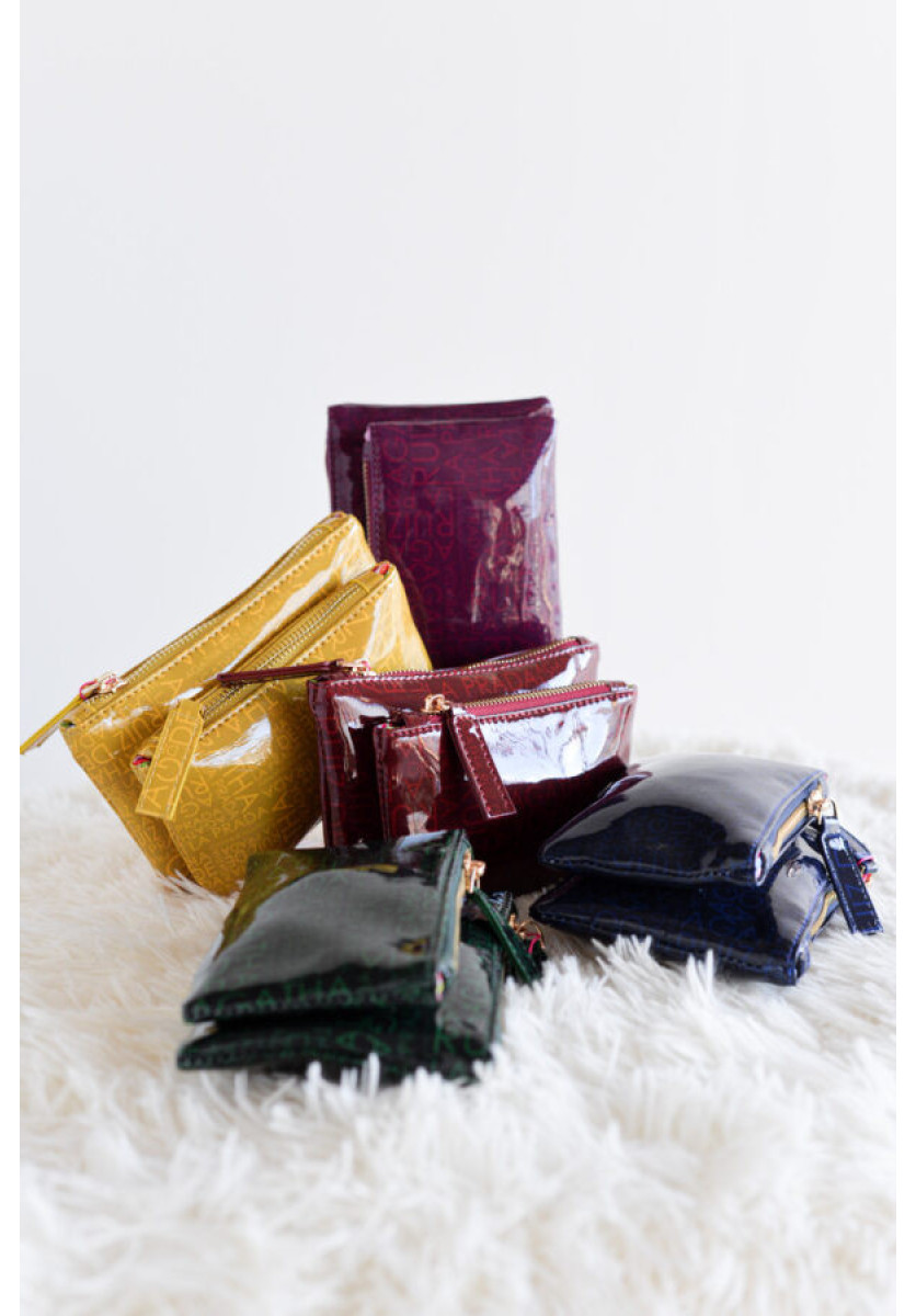 Funcionalidad y diseño se combinan en este neceser o monedero de charol brillante, perfecto para organizar tus objetos pequeños con estilo.