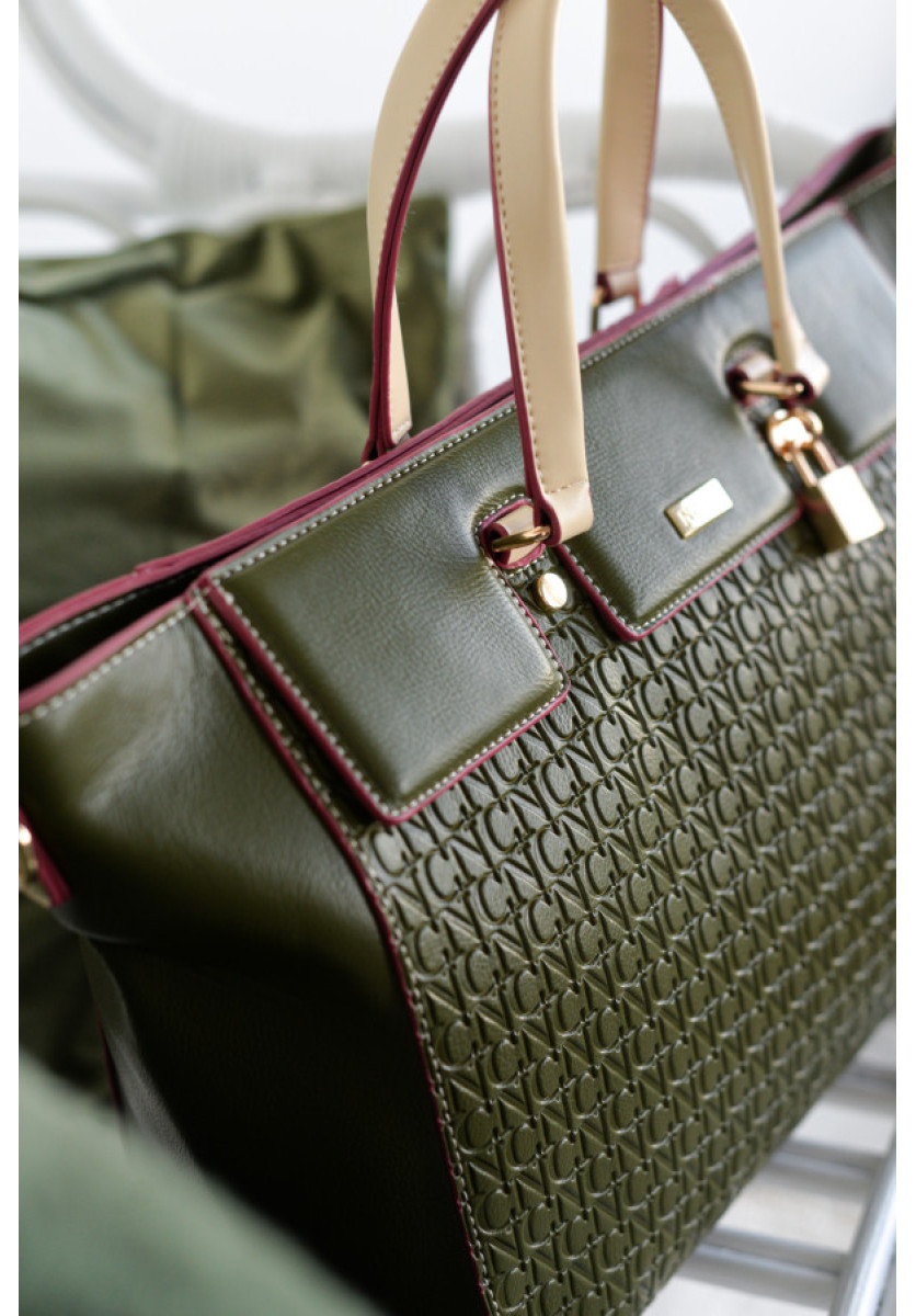 Este bolso tipo shopping es la mezcla perfecta entre funcionalidad y diseño con identidad propia. Está confeccionado en piel vegana suave, con las iniciales NC de Noco grabadas en pequeño por toda la superficie.