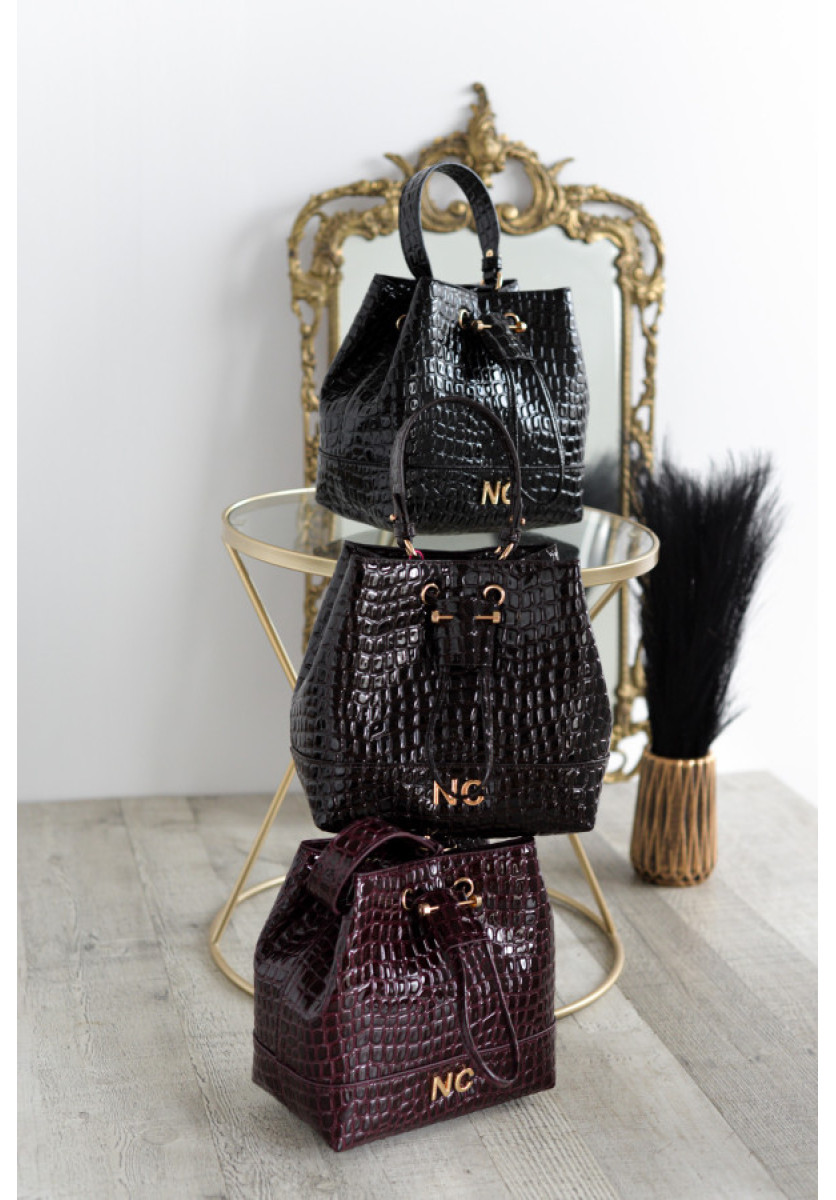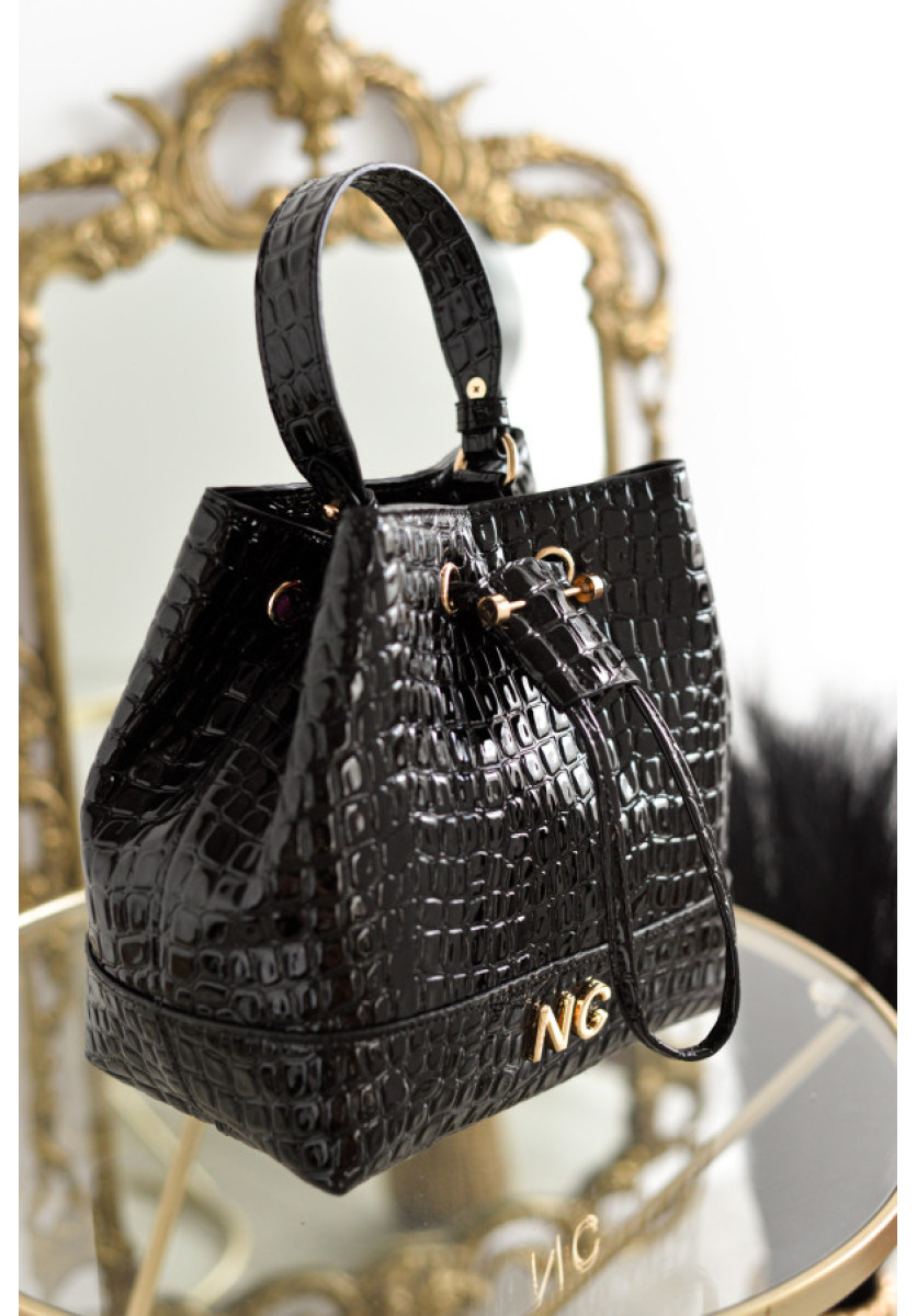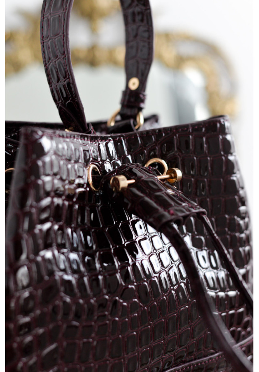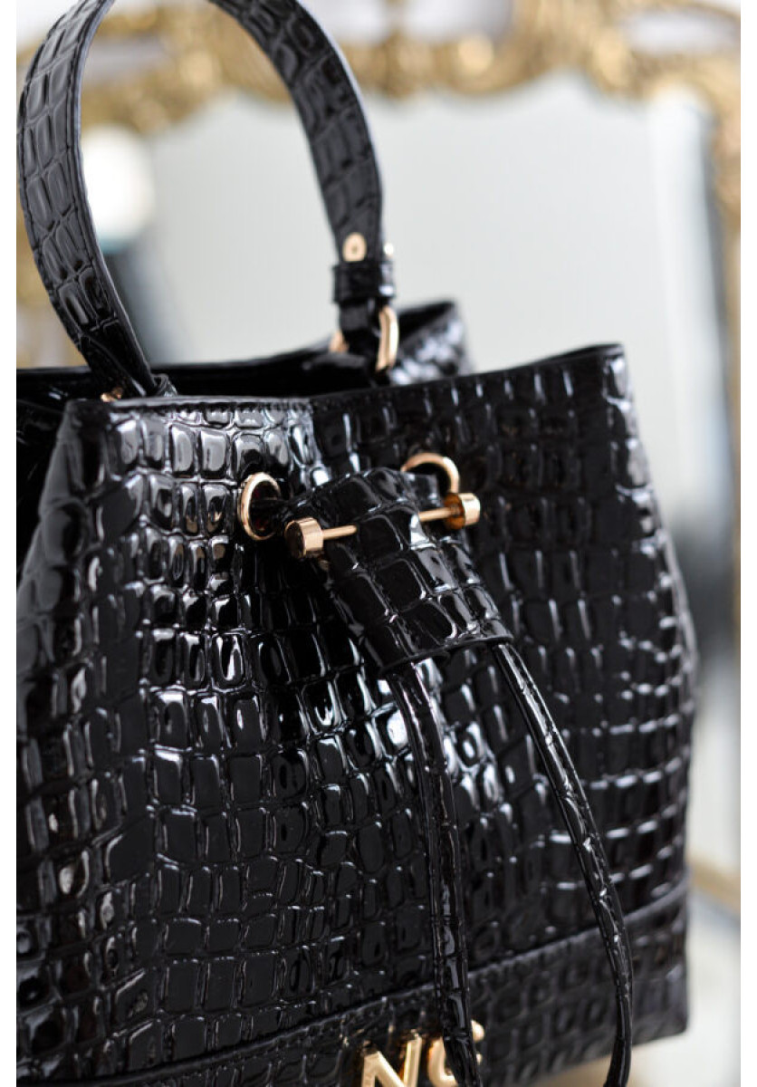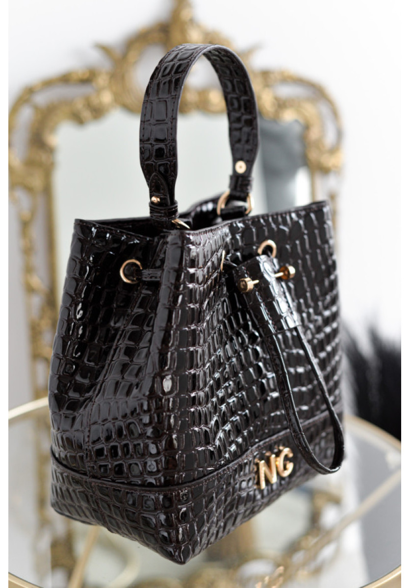 Esta bombonera de tamaño mediano eleva el diseño clásico con un acabado estructurado en charol con textura de cocodrilo, aportando un look elegante y muy actual.
