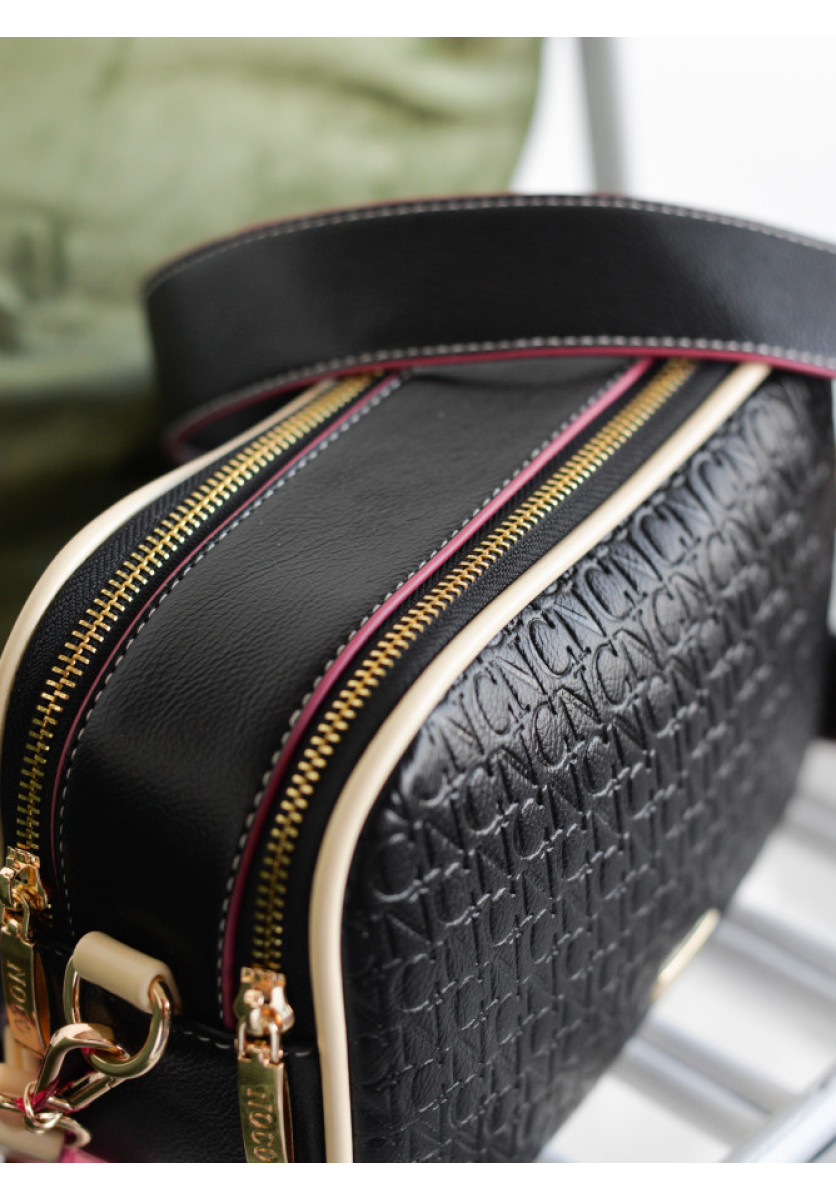 Esta bandolera grande combina diseño inteligente y estilo con personalidad. Está hecha en piel vegana grabada con las iniciales NC en pequeño, con el icónico perfilado fucsia que da ese toque atrevido y único de Noco.