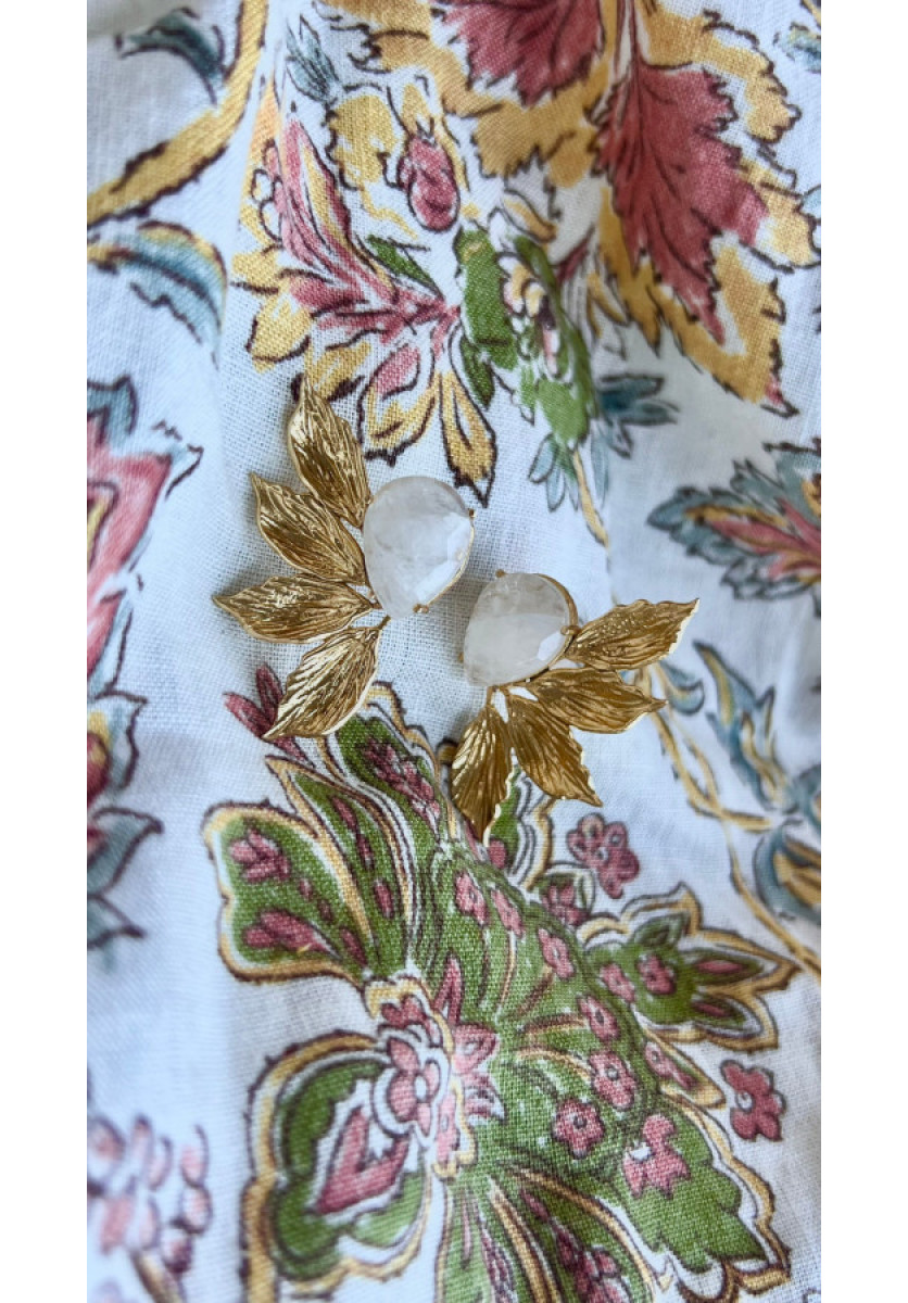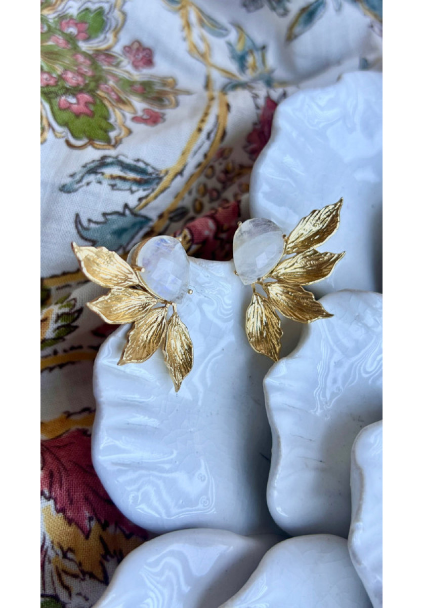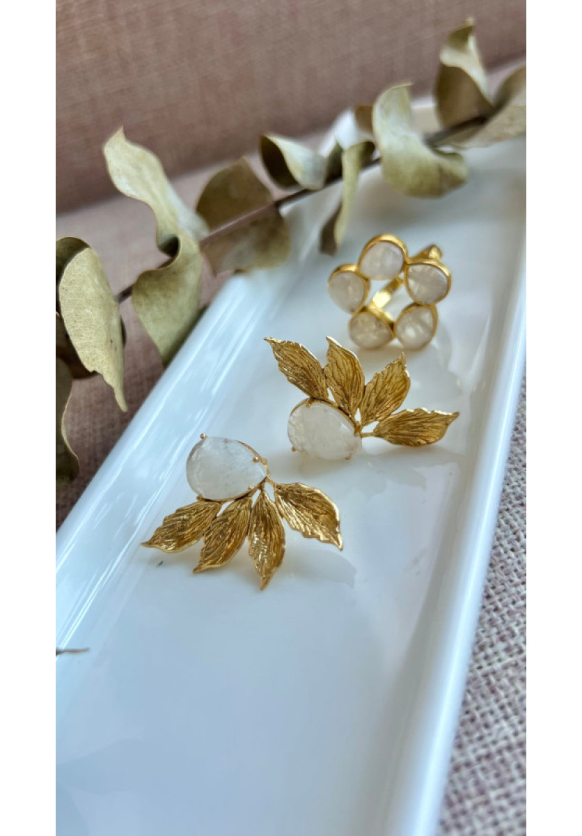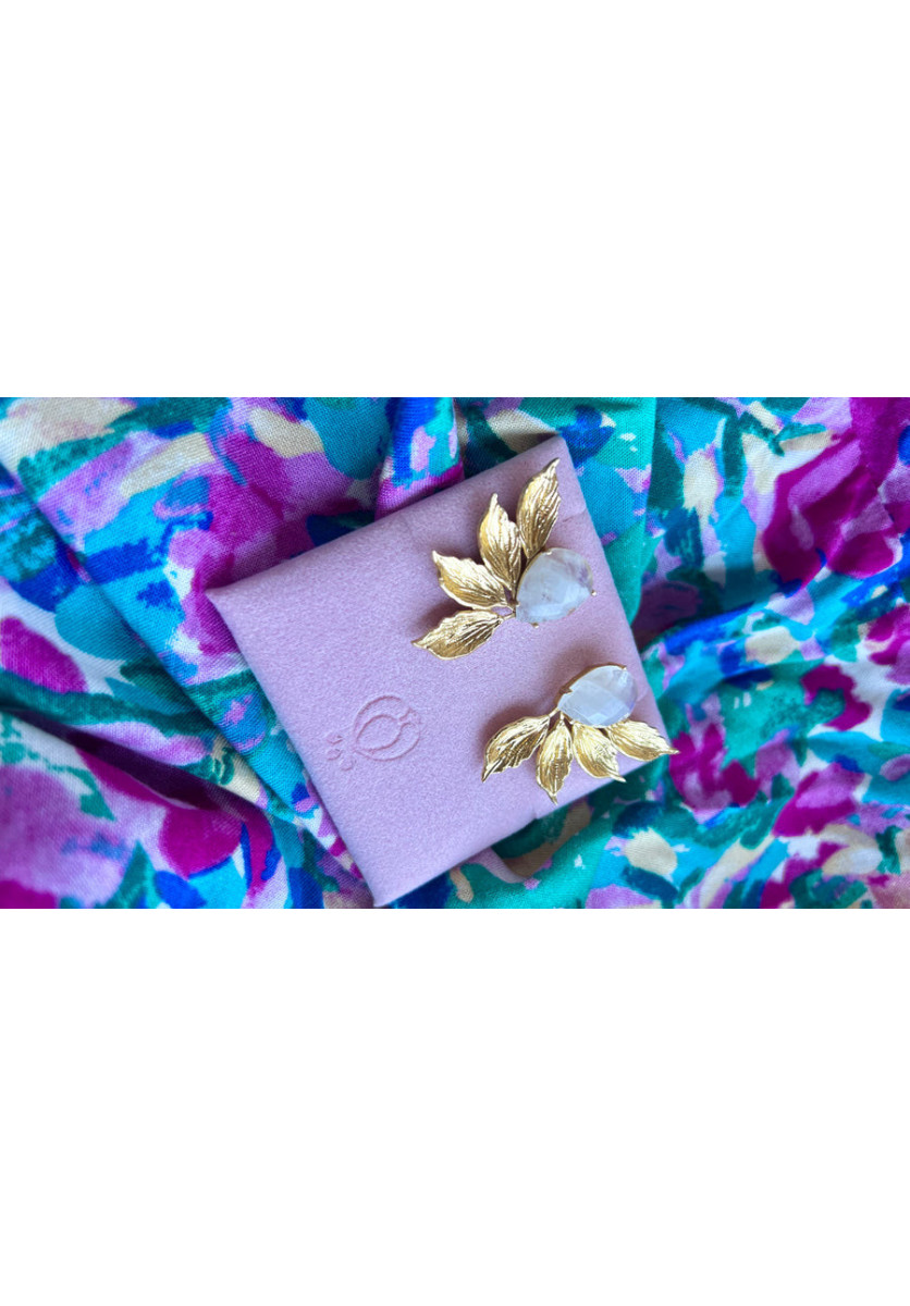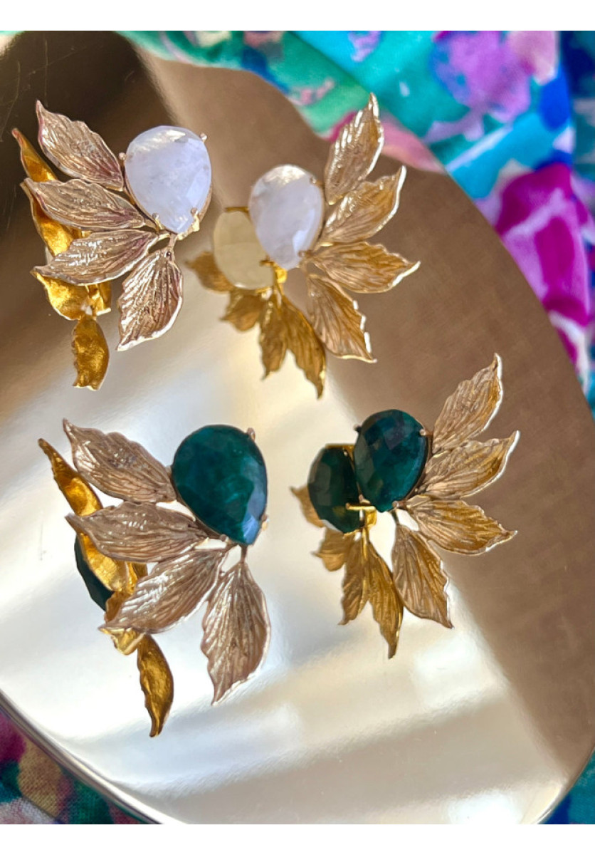 Son unos pendientes exclusivos de Mestiza Joyas compuestos por una piedra que va pegada a la oreja y 4 hojas doradas en forma de abanico. Es un diseño muy ligero y cómodo de llevar