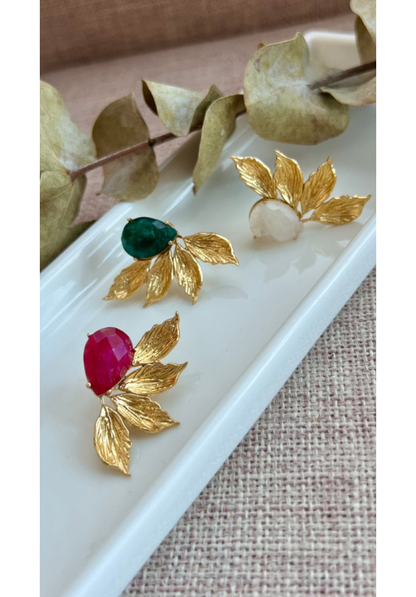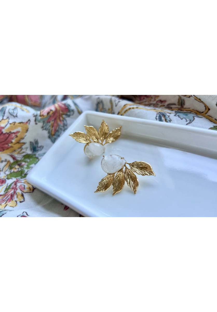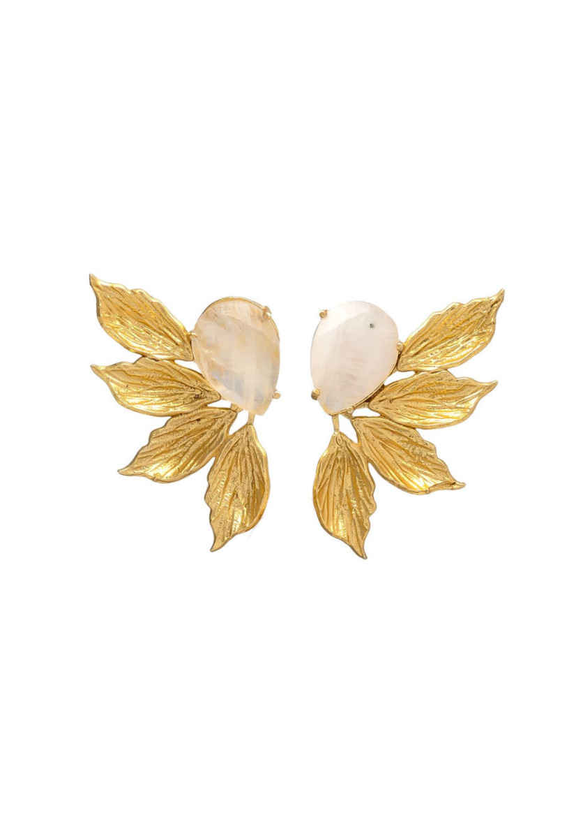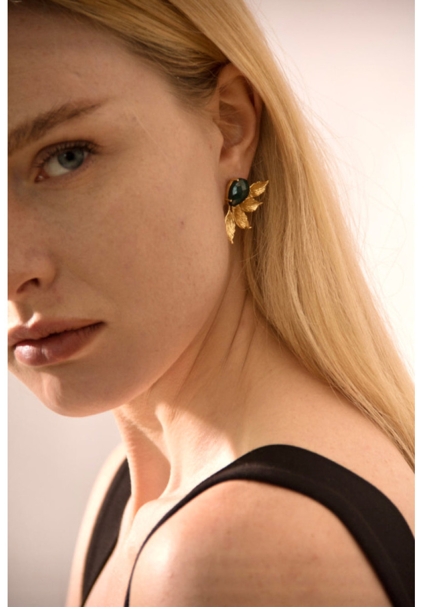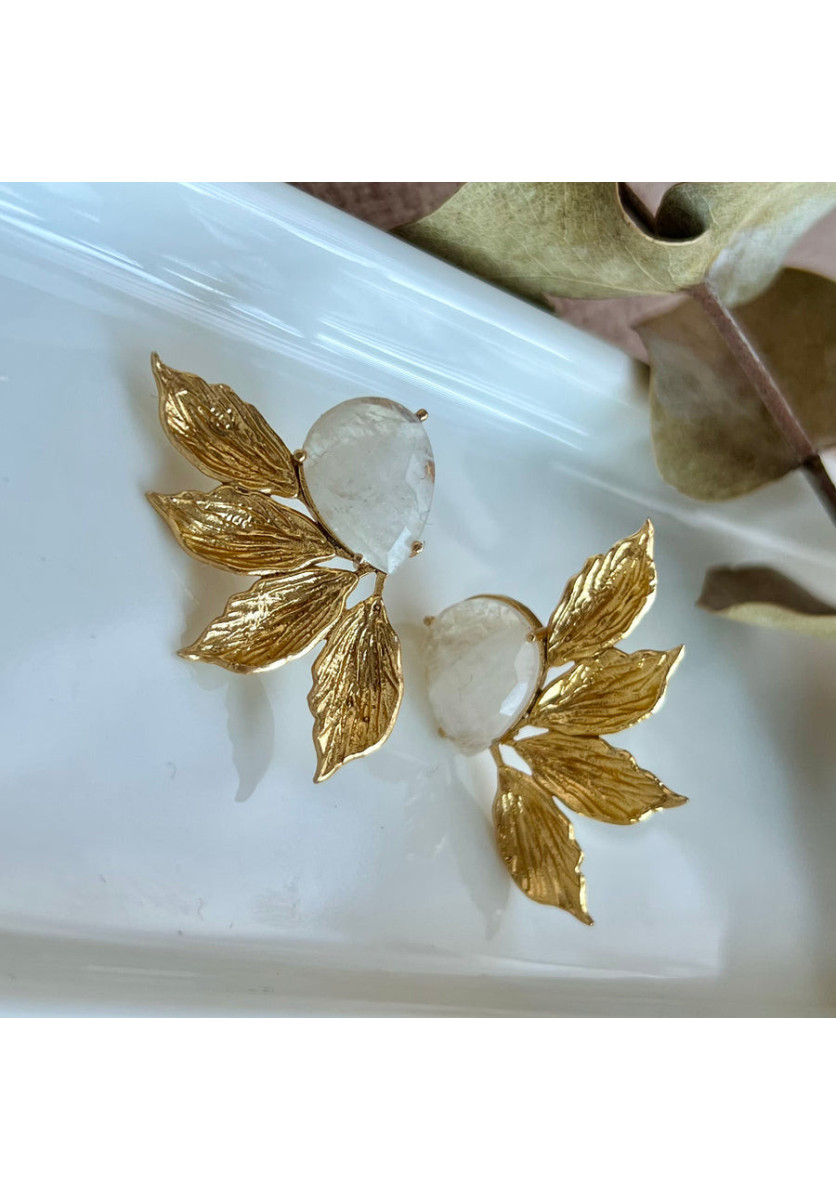 Son unos pendientes exclusivos de Mestiza Joyas compuestos por una piedra que va pegada a la oreja y 4 hojas doradas en forma de abanico. Es un diseño muy ligero y cómodo de llevar