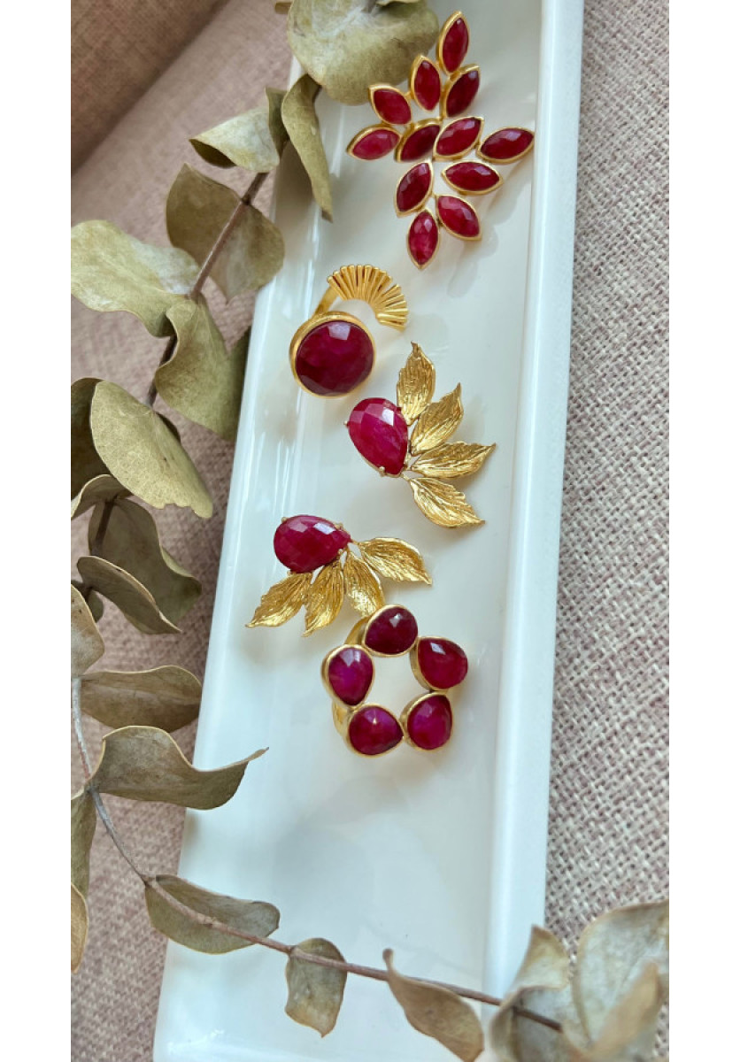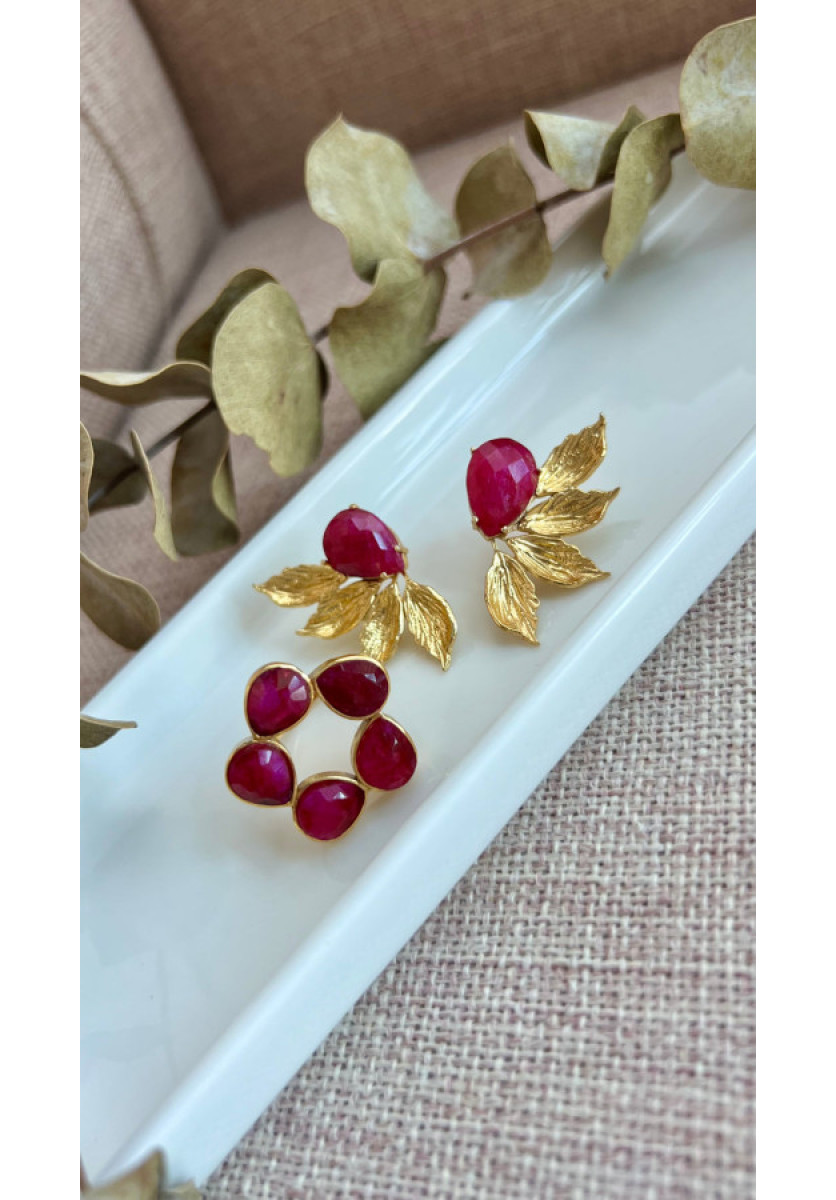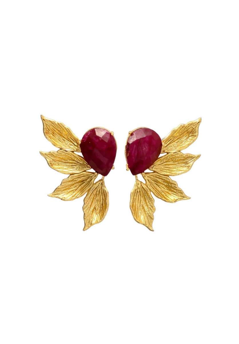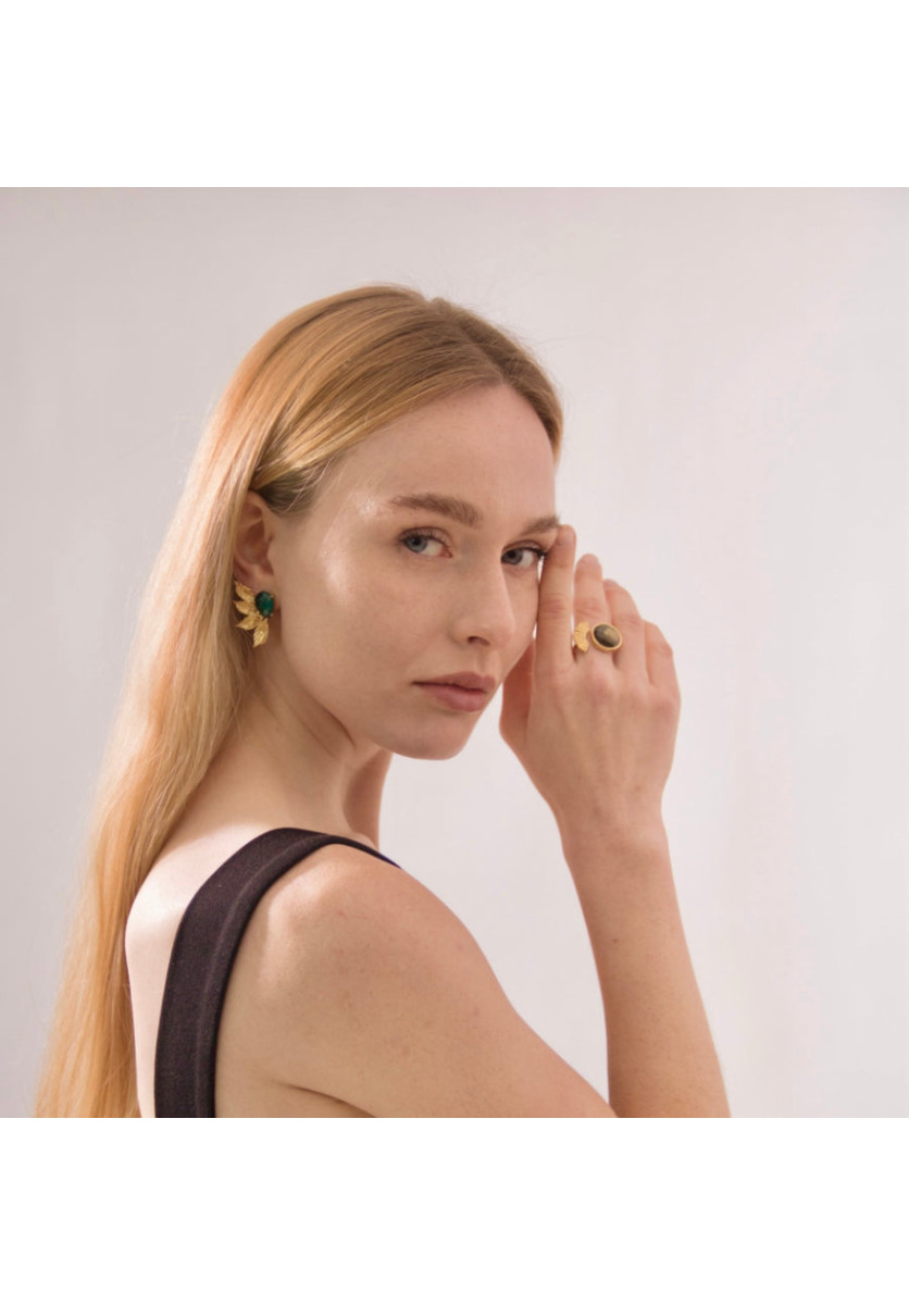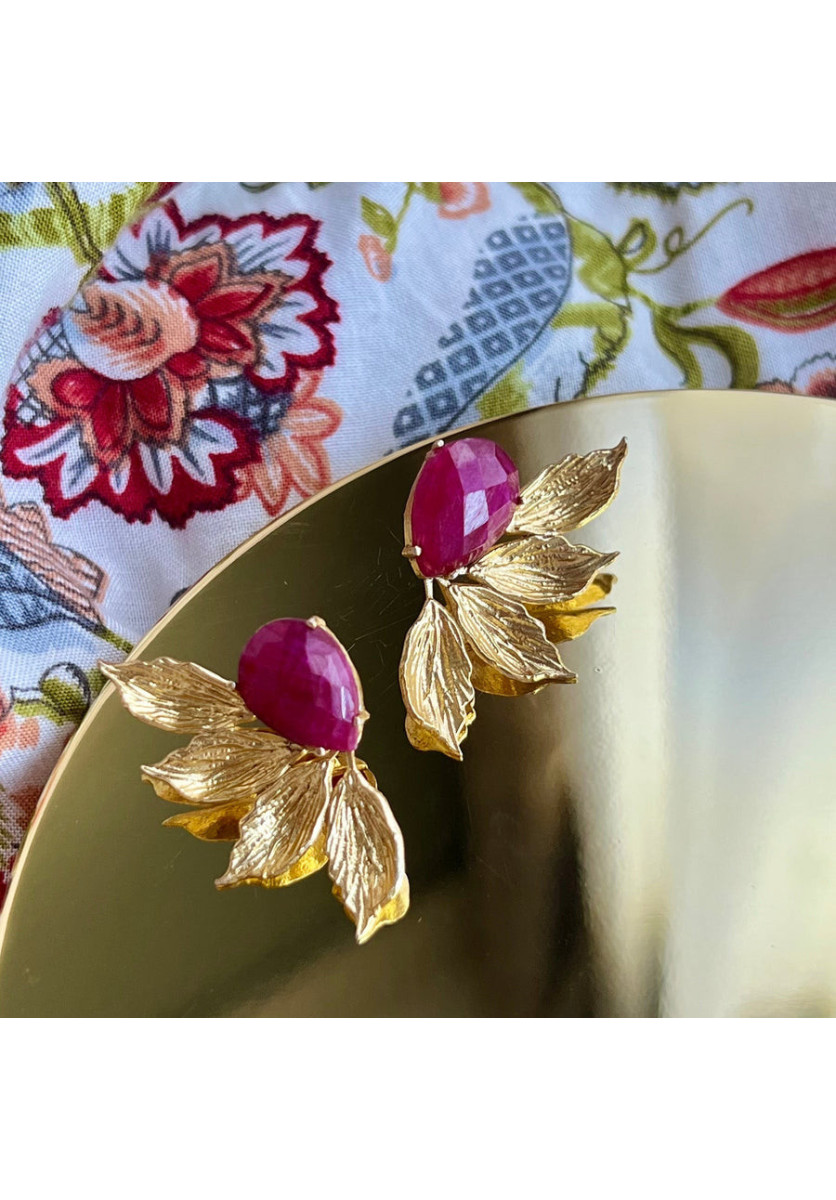 Son unos pendientes exclusivos de Mestiza Joyas compuestos por una piedra que va pegada a la oreja y 4 hojas doradas en forma de abanico. Es un diseño muy ligero y cómodo de llevar