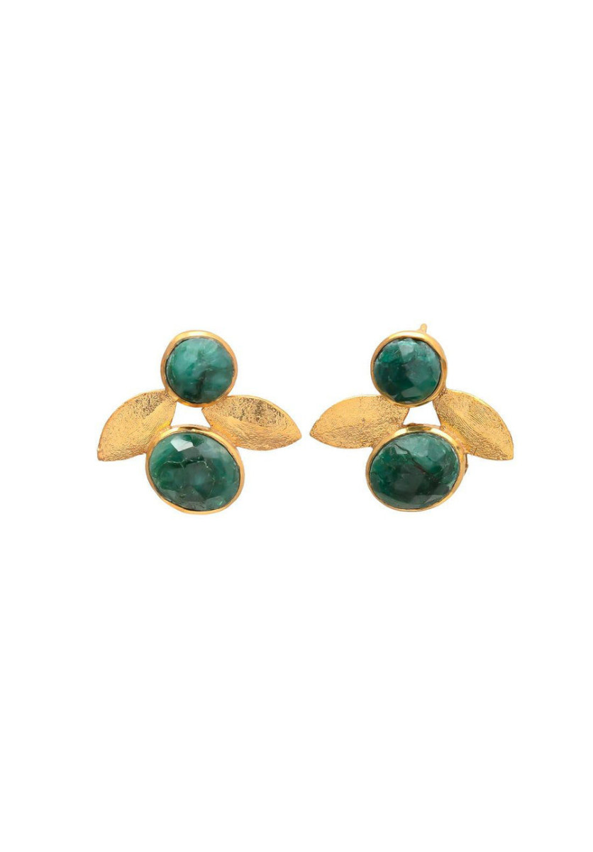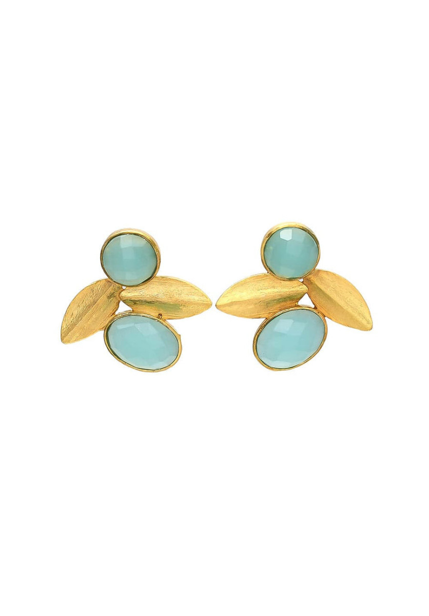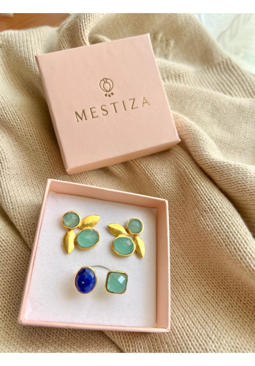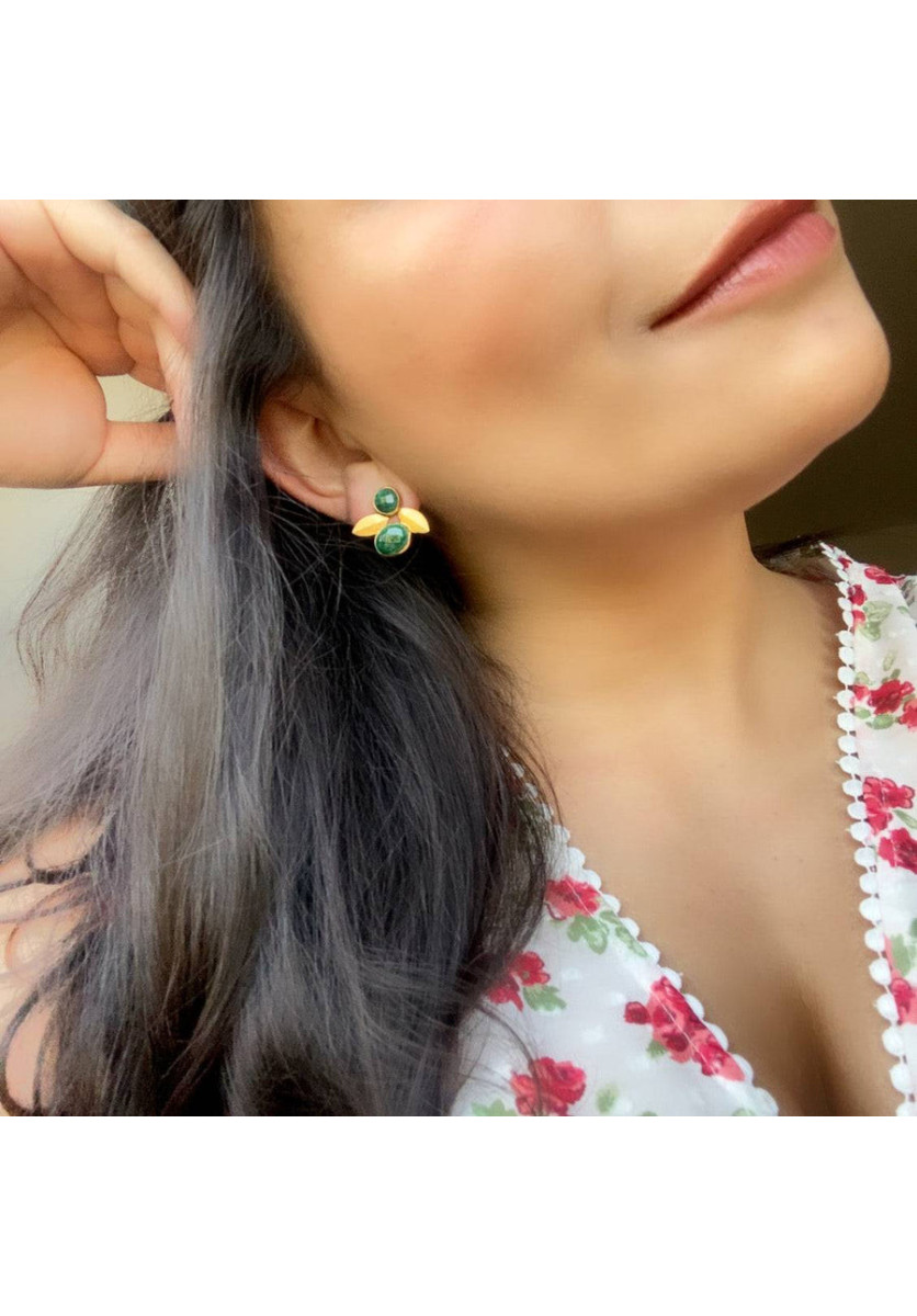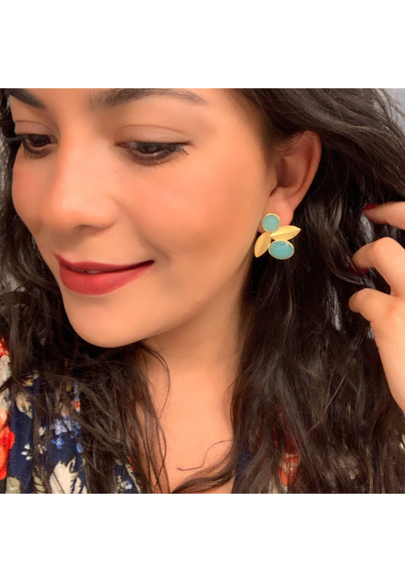 Pendientes de diseño y exclusivos formados por 2 piedras naturales en forma circular y 2 pétalos dorados.