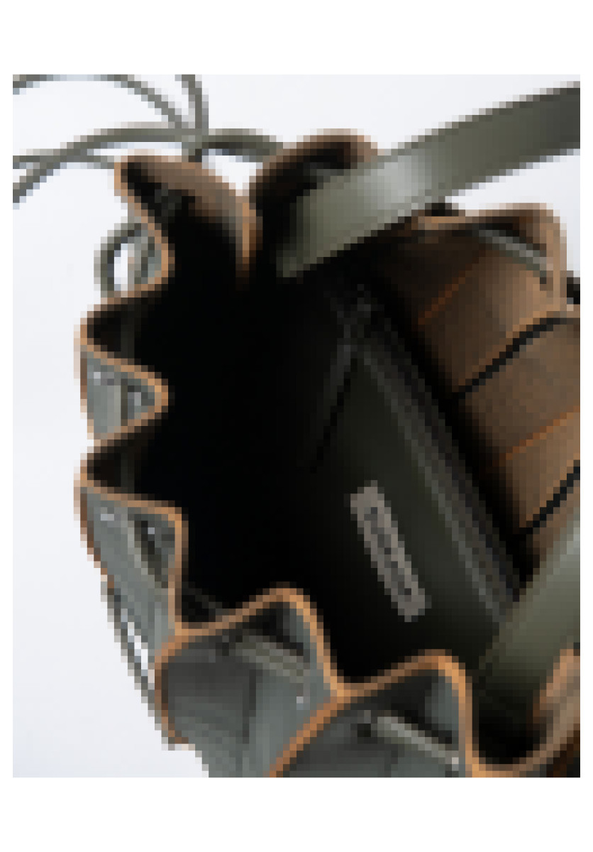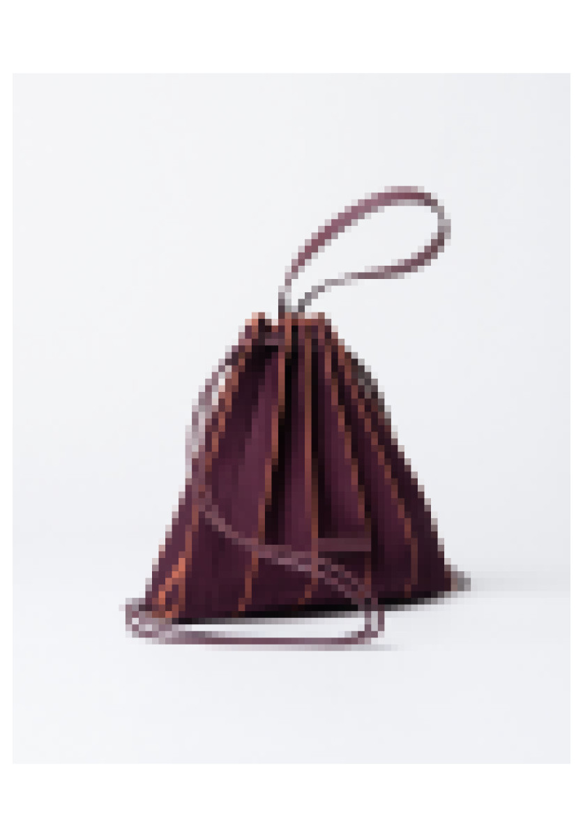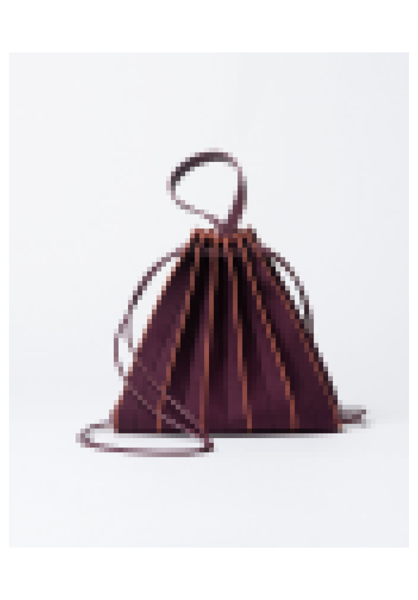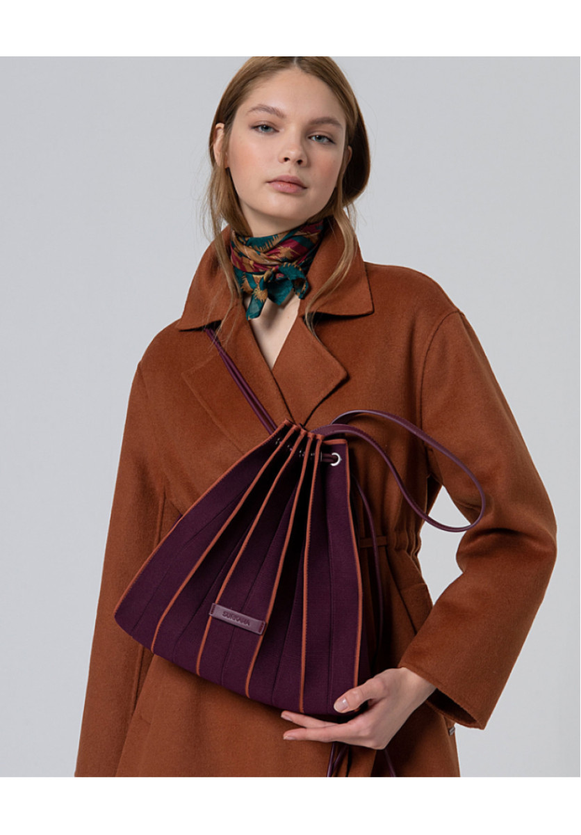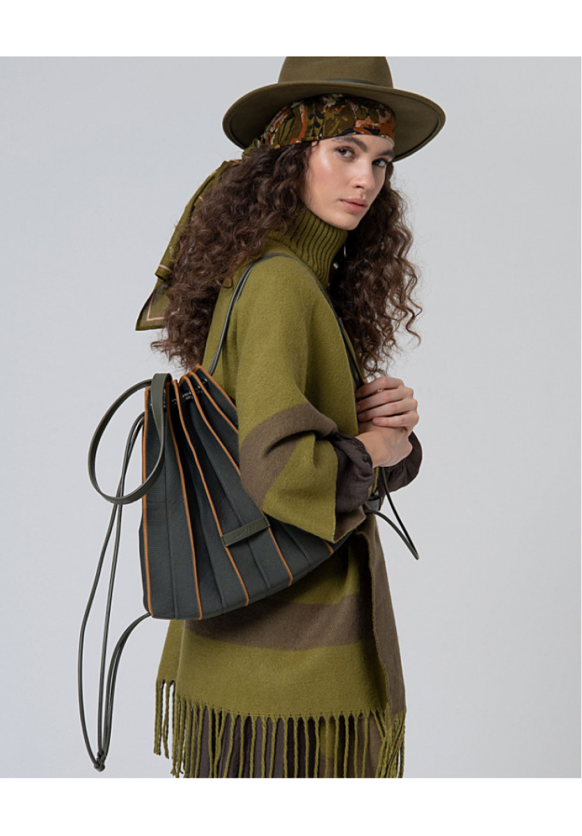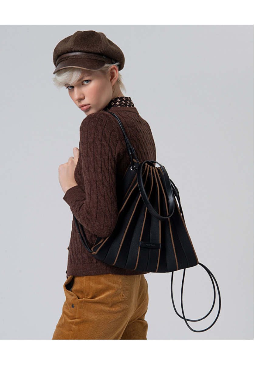 Bolso-mochila confeccionado en punto con textura plisada y un diseño triangular muy especial. El cierre se realiza con cordones que se deslizan a través de ojales, permitiendo ajustarlo fácilmente tirando de las cintas. Incluye un práctico neceser.